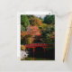 Photography of a red Japanese bridge over a pond at Daigo Temple in Kyoto, with autumn trees in the background.