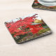 Protect your table top from water marks and stains from drinks with this set of 6, plastic beverage coasters that feature a colourful photo image of bright, red maple leaves and a miniature, red Shinto shrine in a Japanese garden. Photo: Point Defiance Park Japanese Garden