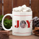 Red Joy with berries Christmas photo coffee mug. It showcases the word "JOY" with red berries and greenery while instead of the letter "O" there is your photo.