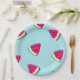 The illustration features vibrant watermelon slices arranged playfully on a bright blue background. Each slice showcases rich green rinds and juicy pink flesh, dotted with shiny black seeds. The design has a cheerful, summery vibe, perfect for outdoor gatherings and picnics. The contrast between the vivid watermelon colours and the soothing blue background creates an inviting and refreshing feel, making these paper plates ideal for any fun event. The overall look is whimsical and appealing, sure to brighten up any table setting!