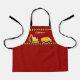 Cool custom red construction vehicle apron for a boy who loves yellow construction vehicles in black and yellow. Fun vehicle gift for kids who loves cars and dump trucks. Customise with your child's name under the digger and black and yellow caution tape.