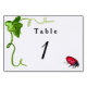 Art features a watercolor of a green vine with a leaf. There is a picture of a red ladybug by the table number. Words note "Table 1" but can be personalised with your own words and messages. Create your own unique one-of-a-kind table card design by customising these template lady bug garden insects table cards for your wedding, reception, or other personal event information.