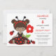 This cute ladybug birthday party invitation is appropriate for girls up to the age of seven or eight. The front features an adorable little African American girl dressed in a red and black polka dot dress and wearing ladybug antennae. Two little polka dot lady bugs and a red flower are beside her. Your custom text is in matching red, black, and grey at the right side. Everything is placed on a white background. The back of the invitation is white with a pattern of little red and black ladybugs. Graphics by Prettygrafik Design, © Prettygrafik.com