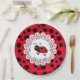 Adorable hand drawn red ladybug themed girl's baby shower pink and black polka dot paper plate.
