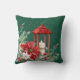 This pretty Holiday pillow has an image of a red poinsettia, white flower and soft green leaves corner bouquet. Just behind the bouquet is an old fashioned red lantern with a white Christmas candle. The image is placed on a medium dark teal green background, and a subtle gold glitter confetti is sprinkled over all. The back of the pillow has the same design. Elegant and festive!