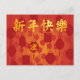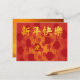 Red and orange silhouettes of various Chinese Lanterns as background with large Chinese cut-out ideograms "Happy New Year" + Happy New Year in English + small orange paper-cut of a dragon on a red lantern you can delete this small image if you want to use the design for all Chinese New Years. Design on horizontal postcard with golden textured paper (image printed). Matching greeting car and more. Perfect for Chinese Dragon New Year 2024.