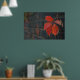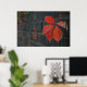A poster showing red leaves with the dark wall as a background