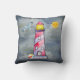 A pillow with a whimsical red-striped lighthouse and a colourful beach ball resting against its wall. A grey seagull flies off in the distance. A yellow sun smiles happily in the sky. Billowing stormy clouds closing in from behind. All done in watercolors.