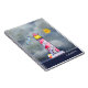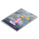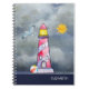 A notebook with a whimsical red-striped lighthouse and a colourful beach ball resting against its wall. A grey seagull flies off in the distance. A yellow sunsmiles happily in the sky. Billowing stormy clouds rising from the background. All done in watercolors.
