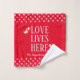 Modern, stylish RED Bath Towel Set, designed with LOVE LIVES HERE in white typography and CUSTOMIZABLE Scripture reference which you can personalise by replacing the placeholder name and dding your favourite text. LOVE LIVES HERE is inspired by the Bible verse in 1 John 4:16, which says "God is love, and he who abides in love abides in God, and God in him." Design includes white serif typography with optional double heart graphics, which you can delete if desired. Matching items and other colours available.