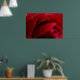 Beautiful macro photograph of a red rose blossom. Big water droplets sit on its delicate petals giving it a fresh summery look.