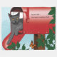 Grey cat that was hiding in a red mailbox waiting for the mailman.
