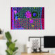 Red, green, teal, black and aqua dominate this complex maze pattern with magenta, lime and sky blue irregular shapes scattered on a geometric background, all encased in a red and fuchsia square boundary. The juxtaposition of colours is amazing! Design by D. Flouton 2012.
