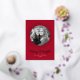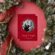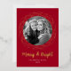 Festive red holiday card featuring your photo encircled by a gold foil dotted circle frame. "Merry and Bright" is displayed in a handwritten gold foil script with your name and the year shown below in white lettering. The card reverses to a white dotted pattern with a red background.