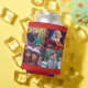Red Merry Christmas can cooler with family photos and changeable text - you can add your family name and your photos, printed on red background