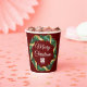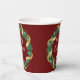 This beautiful company red Christmas party paper cup is custom made with your business logo within a festive holly berry wreath with gold garland wrapping around the greenery. Contemporary holiday decor for your clients or corporate employees.