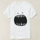 Minimalist red monster illustration with a wide black mouth and sharp white teeth. A bold, flat design character perfect for edgy graphic art projects.