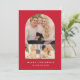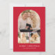 Modern holiday photo card featuring 3 of your photos arranged in an arch-shaped grid layout. Personalise the front of the multi-photo holiday card with your custom greeting and family name displayed in white lettering with a red background. The card reverses to a subtle red and white dot pattern.