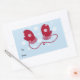 A cute pair of red holiday mittens with a red string and a snowflake design. A background of blue with white snowflakes.