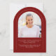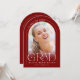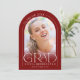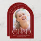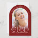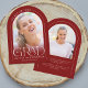 This red simple minimalist arch graduation announcement features a delicate arch frame, 2 photo templates and elegant modern typography.