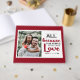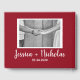 The front of this red modern wedding guestbook features a romantic caption written in red and grey fonts, that reads "All because two people fell in love", with a customisable picture on a white frame.