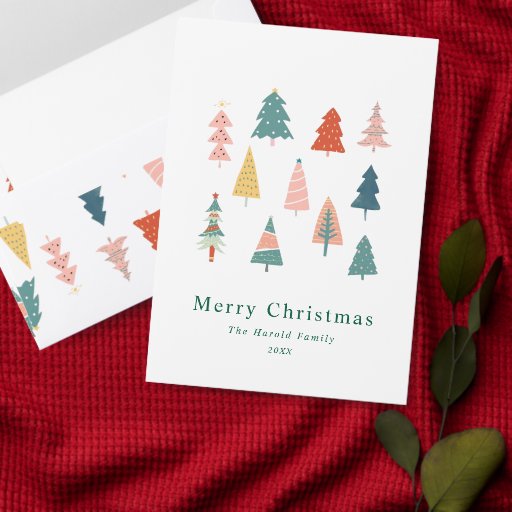Red elegant non-photo holiday card .This chic and simple holiday card features a modern set of Christmas trees. The stylish text can be completely personalised with your choice of greeting, family name, year, and a custom message.