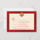A gold double happiness symbol on a shimmering red background. RSVP Chinese Wedding Card.