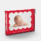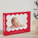 Simple and modern birth announcement photo block featuring your baby's photo nestled inside of a red scalloped frame. Personalise the photo block by adding your baby's name and additional information in white lettering.
