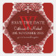 Red Monogram with Unique fractal tribal red & white lace borders - Exquisite and elegant custom Wedding, Engagement, Anniversary Save the Date rounded corner square sticker. All the text can be fully customised, including style of font and colours.