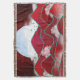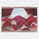 Abstract landscape design in various shades of red with a moonrise, hills, trees, clouds, and birds.