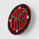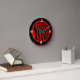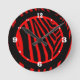 Red and black zebra stripes are the background for this bold wall clock. A black and red ring is the base for the hour numbers in white. The larger numbers mark the quarter hours.