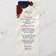 beautiful navy blue and red flowers with gold bronze leaves on marble background botanical wedding menu.