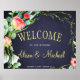Chic and classy horizontal wedding sign poster with rustic garden pink and coral red peony roses with teal blue and sage green foliage and leaves and golden script lettering on dark midnight navy blue chalkboard background. Ideal for your spring summer | autumn fall | garden | outdoor backyard | country rustic elegant themed wedding.