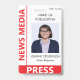Simple vertical press ID in black with an eye-catching red color accent. News Media is written along the side, with Press beneath. Personalize this press ID template with the name of the reporter or photographer, their work title, ID photo, and the name of the publication that's sent this reporter out into the field. Add expiration date at the top. On the back of this practical journalist ID badge, personalize the QR code and add additional text.