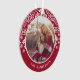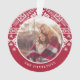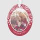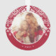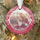 Festive Christmas photo ornament features a favorite photo on each side, encircled by a holiday sweater pattern in cranberry red and white. Personalize with your custom caption; shown with your family name and the year.