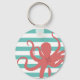This trendy modern beach style keychain contains a red octopus against a white and teal striped background.