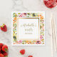Elegant red and orange watercolor floral women's birthday party paper napkins with green leaves and a gold frame. Personalise with the name of the guest of honour and her age.