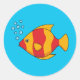 A cartoon red orange tropical fish. He is swimming in the blue ocean while making bubbles. This cute kawaii illustration is good for sea and aquarium lovers and to bring back memories of happy summer tropical holidays.