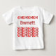 This baby t-shirt has a mid-century modern design of string of ovals in red and brick red, with white ovals and circles made of lines inside them.