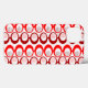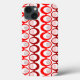 This phone case has a mid-century modern design of string of ovals in red and brick red, with white ovals and circles made of lines inside them.