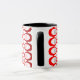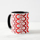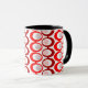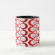 This mug has a mid-century modern design of string of ovals in red and brick red, with white ovals and circles made of lines inside them.