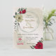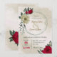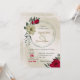 Unique wedding invitation featuring romantic red and pale yellow flowers and green leaves.