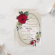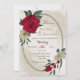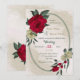 Unique wedding invitation featuring romantic red and pale yellow flowers and green leaves on a beautiful oval geometric frame.