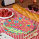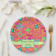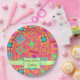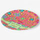 For a birthday for a quilter - serve with this paper plate with the customisable words "Happy Birthday" and personalised with her or his name. This party plate combines favourite quilt blocks plus unique blocks to form a quilt design with vibrant and dynamic colours on a red coral background. A light green bar and emblem gives a place for the customisable words. The patchwork blocks feature stars, applique, pinwheel, log cabin and other favourite quilt blocks. Small flowers and blue dots are on the background between the tossed blocks. This quilt art is from fabric and quilt designer Phyllis Dobbs and is available on coordinating products in this store. Fully customisable - change the words for a quilt meeting or event.