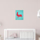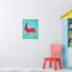 A red, quatrefoil patterned silhouette of a rooster is on a turquoise coloured background with a wood grain texture.