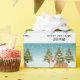 Destei's original cartoon illustration of a red and white coat colour Pembroke Welsh Corgi breed dog. The dog is placed in a winter scene with three green fir trees. The background is a blue to white gradient giving the design that cold winter day look. There is a personalizable text area that now reads: "Merry Christmas!" together with a custom name.