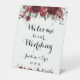 A Welcome To Our Wedding 12 inch by 10 inch self-standing pedestal sign, featuring a watercolor painted bouquet of deep burgundy red peonies and green eucalyptus greeneries cascading over text that reads, "Welcome To Our Wedding," with your first names and numerical date underneath.