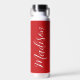 A cute red water bottle with white monogram for a girl or guy who loves simple, handwritten gifts. Beautiful cursive script down the side of your bottle spelling out your name.