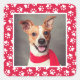 Square holiday photo sticker design for dog lovers features a favourite photo of your pet dog (or cat) with a white paw prints pattern on red frame. Tip: crop your photo to a square format before uploading it to the site.