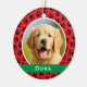 This festive custom holiday ornament can be personalized with a cute photo of your pet dog (or cat) and their first name. Includes a red background color with a green monogram stripe and black paw print pattern. Makes a unique Christmas gift for dog lovers or to celebrate puppy's first Christmas!